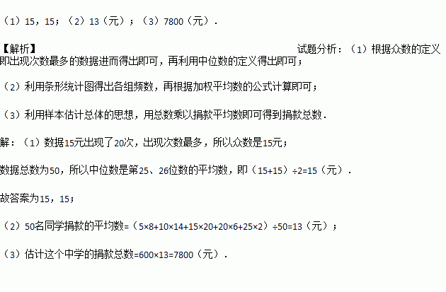 (1)这50名同学捐款的众数为 元,中位数为 元;