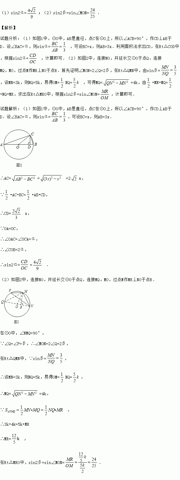 (2)如图2,已知点M,N,P为⊙O上的三点,且∠P=β,sinβ=