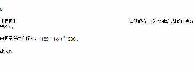某型号的手机连续两次降阶,每个售价由原来的1185元降到580元,设平均每次降价的百分率为,则列出方程正确的是 ( )
