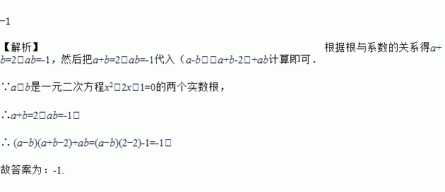 已知a、b是一元二次方程x2﹣2x﹣1=0的两个实数根,则代数式(a﹣b)(a+b﹣2)+ab的值等于__________.