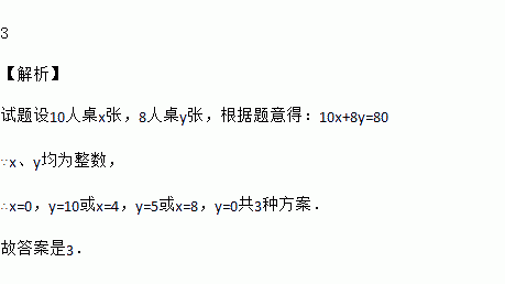 小明家准备春节前举行80人的聚餐,需要去某餐馆订餐.据了解餐馆有10人坐和8人坐两种餐桌,要使所订的每个餐桌刚好坐满,则订餐方案共有______种.