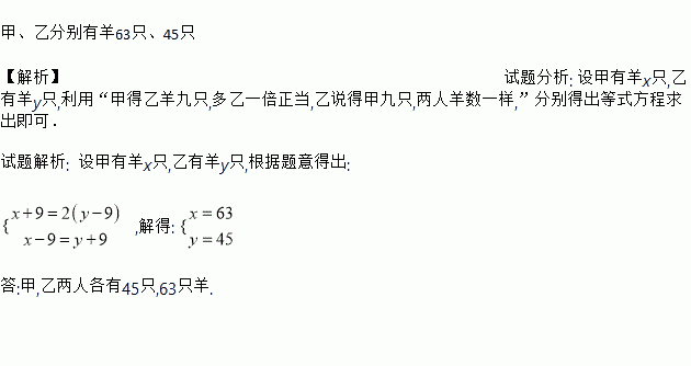 (14分)(数学趣题)隔溪牧羊:甲乙隔溪牧羊,二人相互商量:甲得乙羊九只,多乙一倍正当;乙得甲羊九只,两人羊数一样。问甲乙羊几何,让你算个半晌。