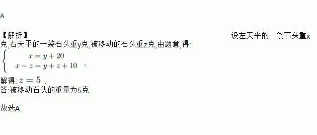 图①的等臂天平呈平衡状态,其中左侧秤盘有一袋石头,右侧秤盘有一袋石头和2个各10克的砝码.将左侧袋中一颗石头移至右侧秤盘,并拿走右侧秤盘的1个砝码后,天平仍呈平衡状态,如图②所示.则被移动石头的重量为( )