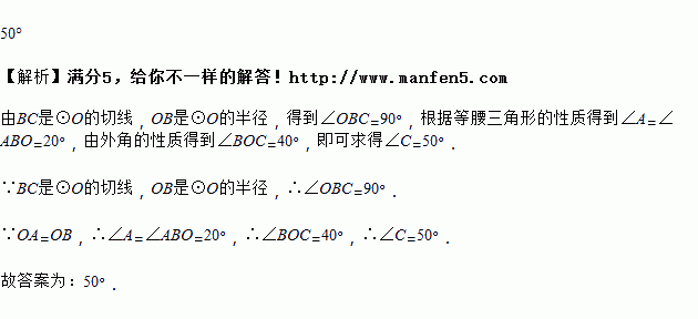 如图,AB是⊙O的弦,AO的延长线交过点B的⊙O的切线于点C,如果∠ABO=20°,则∠C的度数是__________