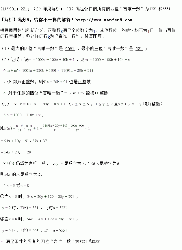 (3)设四位“言唯一数”n=1000x+100y+10y+1(2≤x≤9,0≤y≤9且y≠1,x、y均为整数),若F(n)仍然为“言唯一数”,求所有满足条件的四位“言唯一数”n.