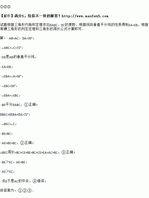 在△ABC中,AB=AC,∠A=36°,DE是AB的垂直平分线,DE交AB于点D,交AC于点E,连接BE.下列结论①BE平分∠ABC;②AE=BE=BC;③△BEC周长等于AC+BC;④E点是AC的中点.其中正确的结论有_____(填序号)
