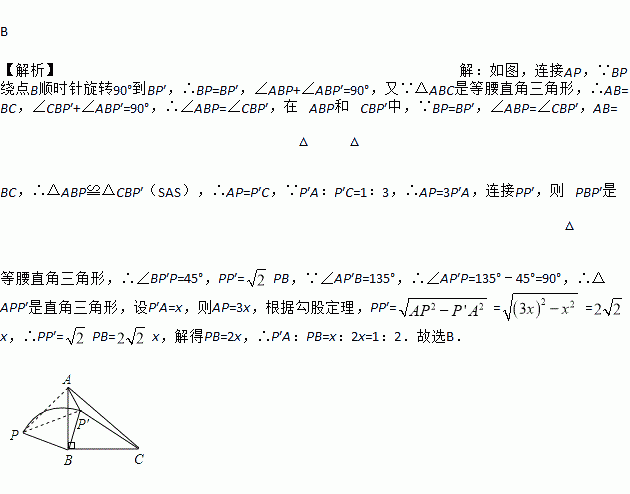 如图,P是等腰直角△ABC外一点,把BP绕点B顺时针旋转90°到BP′,已知∠AP′B=135°,P′A∶P′C=1∶3,则P′A∶PB=( )