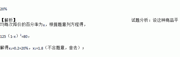 20% 【解析】试题分析:设这种商品平均每次降价的百分率为x,根据题意列方程得, 125(1-x)2=80, 解得x1=0.2=20%,x2=1.8(不合题意,舍去);
