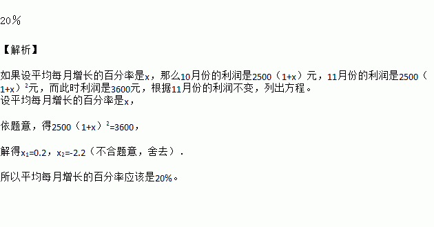 20% 【解析】 如果设平均每月增长的百分率是x,那么10月份的利润是2500(1+x)元,11月份的利润是2500(1+x)2元,而此时利润是3600元,根据11月份的利润不变,列出方程。 设平均每月增长的百分率是x, 依题意,得2500(1+x)2=3600, 解得x1=0.2,x2=-2.2(不合题意,舍去). 所以平均每月增长的百分率应该是20%。