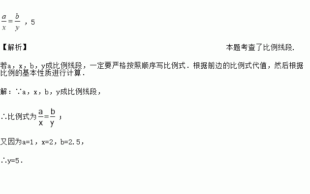 若a, x,b, y成比例线段,则比例式为 ;若a=1,x=2,b=2.5,则y= .