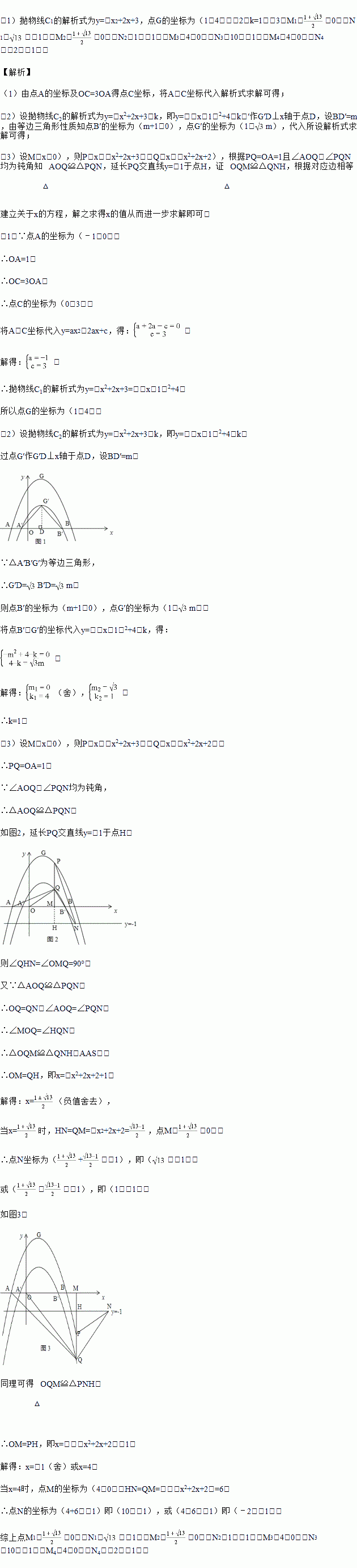 (3)在(2)的条件下,如图3,设点M为x轴正半轴上一动点,过点M作x轴的垂线分别交抛物线C1、C2于P、Q两点,试探究在直线y=﹣1上是否存在点N,使得以P、Q、N为顶点的三角形与△AOQ全等,若存在,直接写出点M,N的坐标:若不存在,请说明理由.