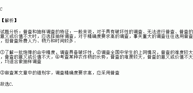 ③审查某文章中的错别字; ④考查某种农作物的长势