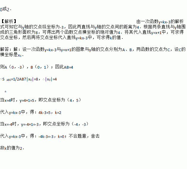 0或2. 【解析】由一次函数y=kx-3的解析式可知它与y轴的交点纵坐标为-3,因此两直线与y轴的交点间的距离为4.根据两条直线与y轴围成的三角形面积为8,可得出两个函数交点横坐标的绝对值为4.将其代入直线y=x+1中,可求得交点坐标,然后再将交点坐标代入直线y=kx-3中,可求得k的值. 解答:【解析】 设一次函数y=kx-3与y=x+1的图象与y轴的交点分别为A、B,两函数的交点...