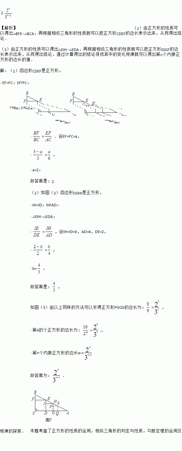 (2)如图2,四边形DGHI是(1)中△EDA的内接正方形,那么第2个正方形DGHI的边长记为a2;继续在图2中的△HGA中按上述方法作第3个内接正方形……以此类推,则第n个内接正方形的边长an=____. (n为正整数)