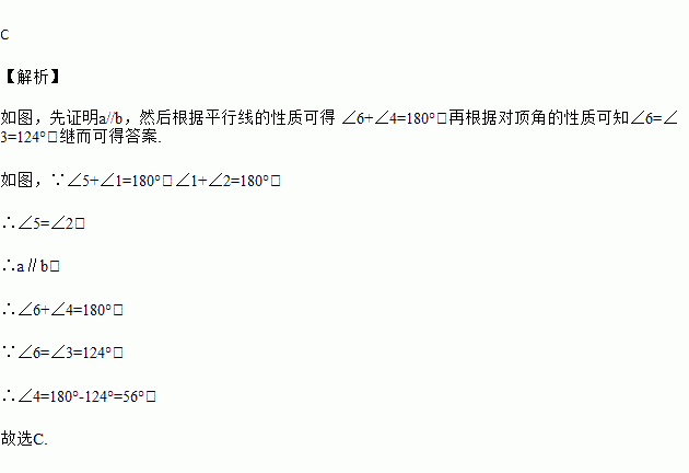 如图,已知∠1+∠2=180°,∠3=124°,则∠4=( )