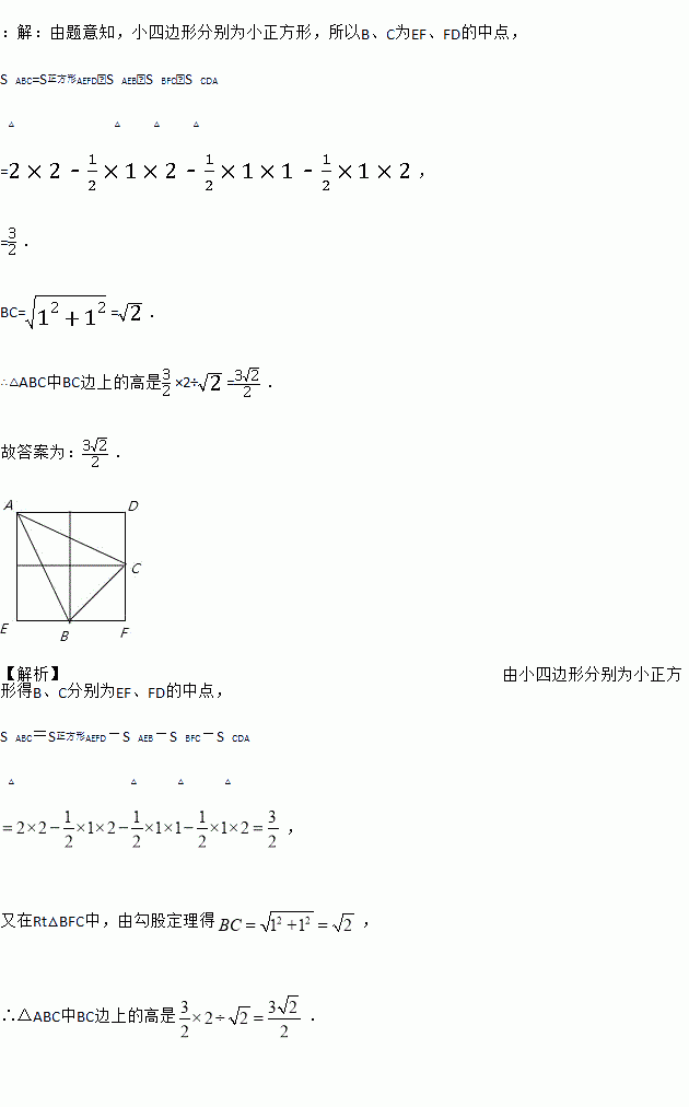 如图,由四个边长为1的小正方形构成一个大正方形,连结小正方形的三个顶点,可得 到△ABC,则△ABC中BC边上的高是 .