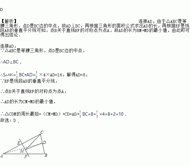 如图,等腰△ABC的底边BC长为4,面积为16,腰AC的垂直平分线EF分别交AC、AB边于E、F两点,若D为BC边中点,点M为线段EF上一动点,则△CDM周长的最小值为 ( )