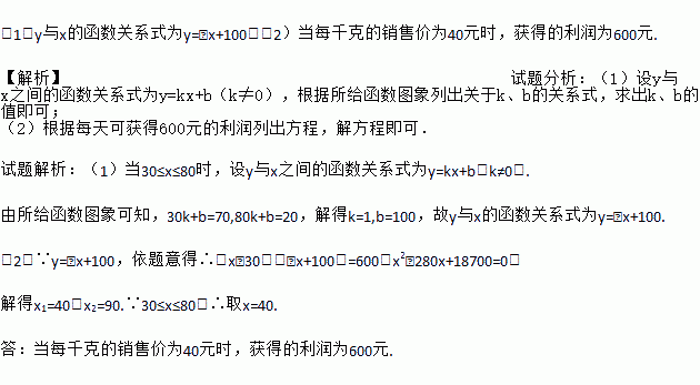 (2)若该种商品每千克的成本为30元,当每千克的销售价为多少元时,获得的利润为600元?