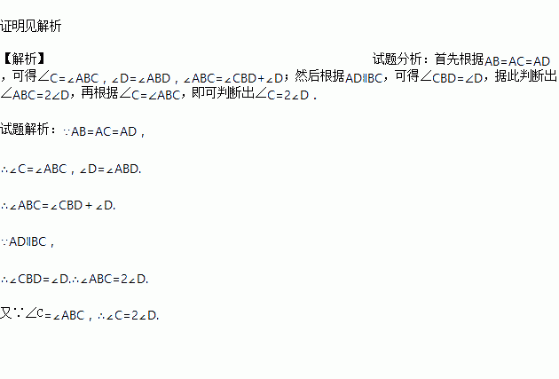 如图,已知AB=AC=AD,且AD∥BC,求证:∠C=2∠D.