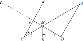 分析:延长AB交DF的延长线于G,根据菱形的性质可得AB∥CD,再根据两直线平行,内错角相等可得∠2=∠G,根据点F为BC的中点得到BF=CF,然后利用“角角边”证明△BFG和△CDF全等,根据全等三角形对应边相等可得GF=DF,再根据两直线平行,内错角相等可得∠1=∠3,然后求出∠1=∠G,∠2=∠3,根据等角对等边的性质可得MC=MD,MA=MG,再根据等腰三角形三线合一的性质求出CE=