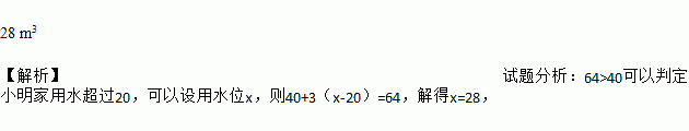 28 m3 【解析】试题分析:64>40可以判定小明家用水超过20,可以设用水位x,则40+3(x-20)=64,解得x=28,
