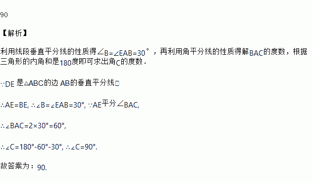 如图,DE是三角形ABC的边AB的垂直平分线,分别交AB、BC于D、E,AE平分∠BAC,若∠B=30度,则∠C=________ 度.