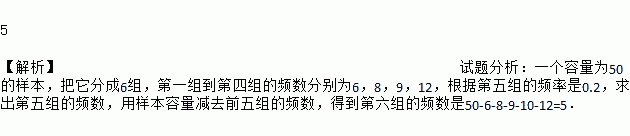 在一次数学测试中 ,某班50名学生的成绩分为六组,第一组到第四组的频数分别为6,8,9,12,第五组的频率是0.2 ,则第六组的频数是_______.