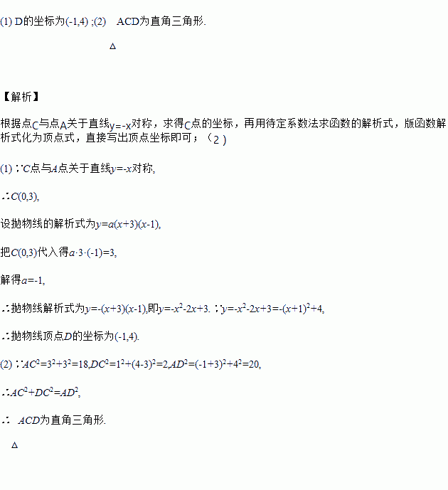 (1)求抛物线的解析式,并求抛物线顶点D的坐标;
