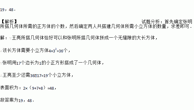 如图,在一次数学活动课上,张明用17个边长为1的小正方形搭成了一个几何体,然后他请王亮用其他同样的小正方体在旁边再搭一个几何体,使王亮所搭几何体恰好可以和张明所搭几何体拼成一个无缝隙的大长方体(不改变张明所搭几何体的形状),那么王亮至少还需要 个小立方体,王亮所搭几何体的表面积为 .