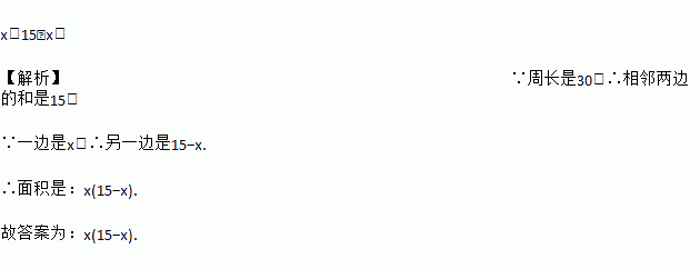 x(15﹣x) 【解析】∵周长是30,∴相邻两边的和是15, ∵一边是x,∴另一边是15?x. ∴面积是:x(15?x). 故答案为:x(15?x).