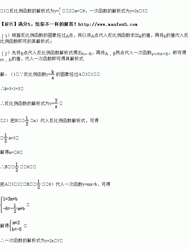 如图,一次函数y=mx+b的图象与反比例函数y=的图象交于A(3,1),B(﹣,n)两点.