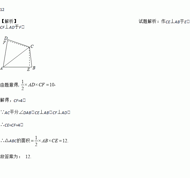 如图,在四边形ABCD中,AC平分∠DAB,AD=5,AB=6,若的面积为10,则的面积为_______.