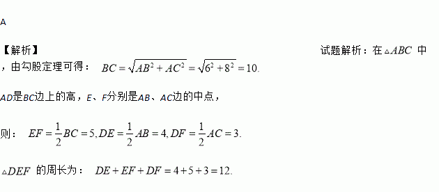 如图,在△ABC中,∠BAC=90°,AD是BC边上的高,E、F分别是AB、AC边的中点,若AB=8,AC=6,则△DEF的周长为( )