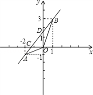 已知函数y=kx+b的图象经过A(﹣2,﹣1)、B(1,3)两点,分别交x、y轴于点C、D。