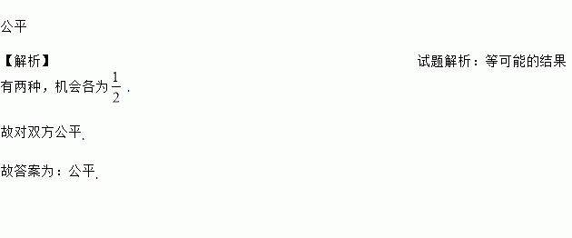 小明和小斌都想去参加一项重要的活动,但只有一个名额.于是他们决定抓阄,两张纸条:一张写着“yes”,一张写着“no”,他们两人闭上眼睛随机各抓一张,抓住“yes”的就去,抓住“no”的就不去,这对双方公平吗?答:________(填“公平”或“不公平”).