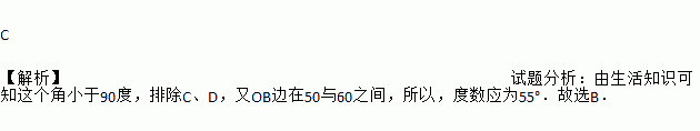 C 【解析】试题分析:由生活知识可知这个角小于90度,排除C、D,又OB边在50与60之间,所以,度数应为55°.故选B.