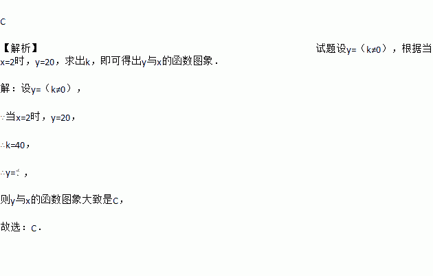 一台印刷机每年可印刷的书本数量y(万册)与它的使用时间x(年)成反比例关系,当x=2时,y=20,则y与x的函数图象大致是( )