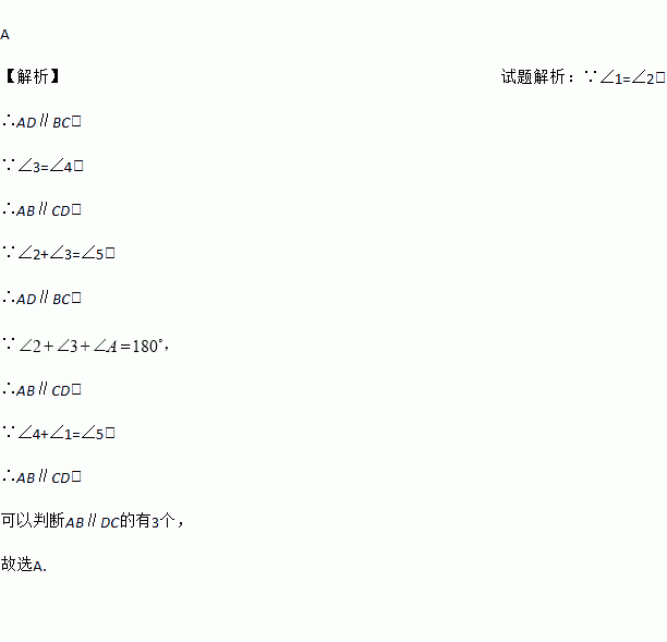 如图,下列条件:∠1=∠2;∠3=∠4;∠2+∠3=∠5;∠2+∠3+∠A=180°;∠4+∠1=∠5,能判定AB∥DC有( )