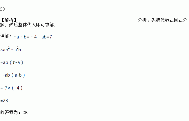 如果a﹣b=﹣4,ab=7,那么ab2﹣a2b的值是_____.