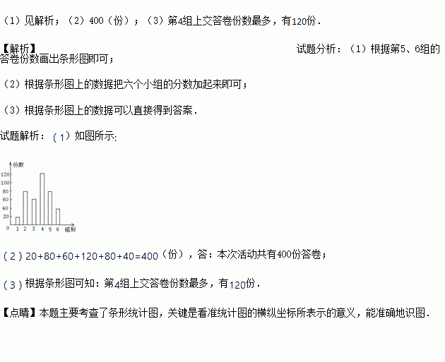 某报社在国庆前夕开展了随报有奖竞赛活动,限于9月1日到9月30日上交答卷,编辑部把学生上交的答卷份数按5天一组分组统计,绘制了如图所示的条形统计图.已知从左到右各长方形的高的比为1:4:3:6.第3组的答卷份数为60,第5、6组的答卷份数分别为80和40.
