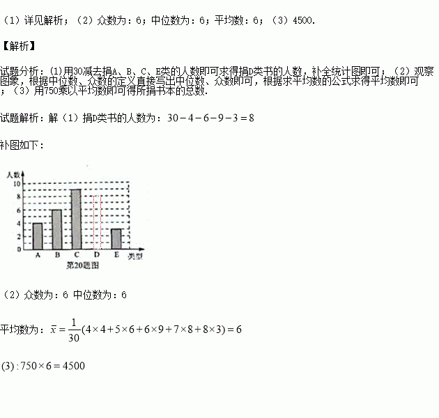 名职工捐书本数的平均数、众数和中位数;