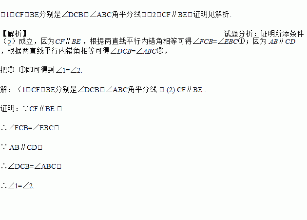 如图,已知AB∥CD,试再添上一个条件使∠1=∠2成立(要求给出两个以上答案)并选择其中一种情况加以证明.