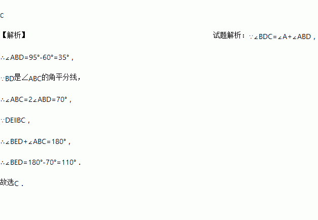 如图,△ABC中,BD是 ∠ ABC的角平分线,DE∥BC,交AB 于点E, ∠A=60º, ∠BDC=95°,则∠BED的度数是( )