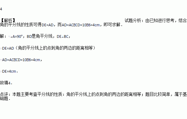 如图所示,△ABC中,∠A=90°,BD是角平分线,DE⊥BC,垂足是E,AC=10cm,CD=6cm,则DE的长为______cm.