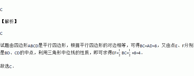 如图,在平行四边形ABCD中,AD=8,点E,F分别是BD,CD的中点,则EF等于( )