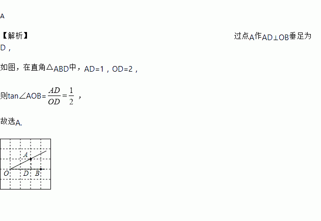 如图,在边长为1的小正方形组成的网格中,点A、B、O为格点,则tan∠AOB=( )