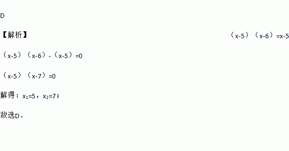 D 【解析】(x-5)(x-6)=x-5 (x-5)(x-6)-(x-5)=0 (x-5)(x-7)=0 解得:x1=5,x2=7; 故选D.