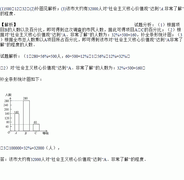 (3)若该市约有市民100000人,请你根据抽样调查的结果,估计该市大约有多少人对“社会主义核心价值观”达到“A.非常了解”的程度.