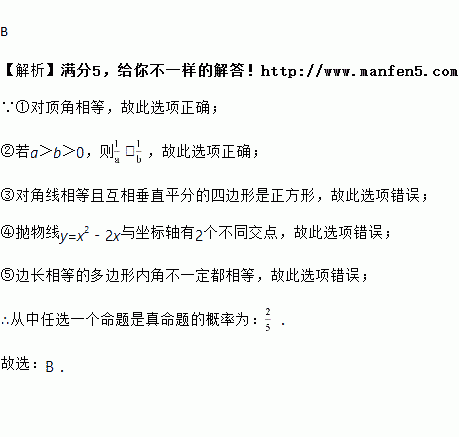 ;③对角线相等且互相垂直的四边形是正方形;④抛物线y=x2﹣2x与坐标轴有3个不同交点;⑤边长相等的多边形内角都相等.从中任选一个命题是真命题的概率为( )