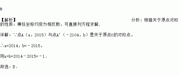 已知点A(a,2015)与点A'(﹣2104,b)是关于原点O的对称点,则a+b的值为( )